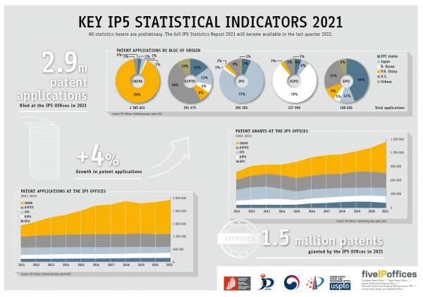 특허청은 세계 특허분야 5대 선진국 협의체인 IP5가 공동으로 발표한 “IP5 핵심 통계지표 2021”에 따르면, ’21년 IP5 특허출원은 총 289만 건으로 전년대비 약4% 증가했다고 21일 밝혔다.