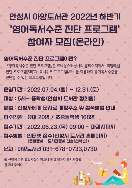해당 프로그램에 참여를 원한다면 회원증을 소지한 도서관 정회원이어야 하며 6월 23일 오전 9시부터 안성시 도서관 홈페이지 내 ‘문화행사-도서관 행사신청’ 탭에서 신청하면 된다.
