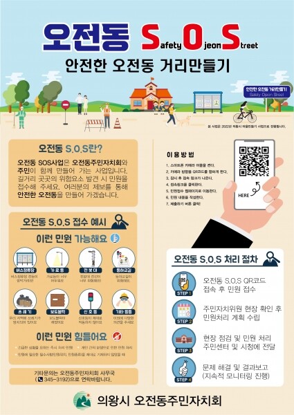 ‘오전동 S.O.S.’는 오전동주민자치회와 주민이 함께 만들어가는 사업으로 길거리 곳곳의 위험요소를 발견하는 즉시 QR코드를 통해 불편사항을 빠르고 편리하게 접수해 해결하는 사업이다.