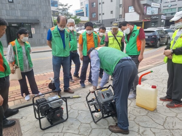 이날 평택시 자율방재단 조성명 단장과 유웅준 기술위원의 지도하에 양수기 등 재난장비에 대한 작동법 교육과 장비 점검이 이뤄졌으며 도로변 배수로 주변 잡초와 쓰레기를 수거하는 등 재난예방 환경정비활동도 실시했다.
