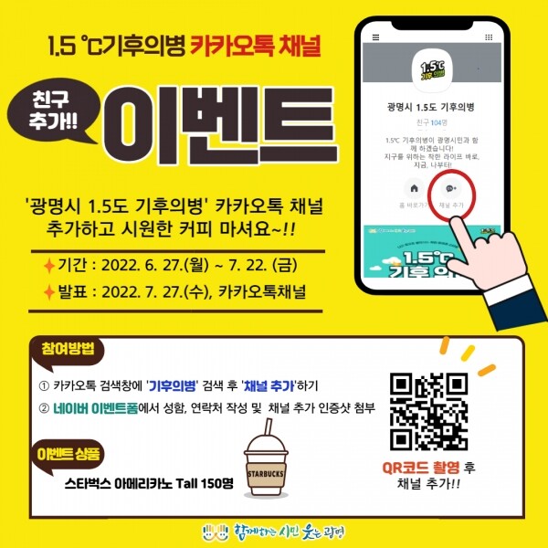 ‘카카오톡 채널 친구 추가 이벤트’ 참여 방법은 1.5℃ 기후의병 카카오톡 채널 친구 추가 인증 화면을 캡처해 네이버폼으로 제출하면 된다.