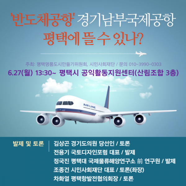 평택명품도시위원회 및 시민사회재단이 주최하는 가운데 27일 오후1시반 평택시 공익활동지원센터에서 이뤄지는 이번 토론회는 “‘반도체공항’ 경기남부국제공항, 평택에 뜰 수 있나?”라는 제목으로 열린다.