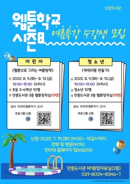 여름특강은 어린이와 청소년을 대상으로 하며 안중도서관 웹툰 창작실에서 대면강좌로 운영된다.