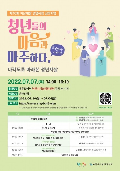 부천시보건소 김은옥 건강도시과장은 “이번 심포지엄을 통해 청년들의 자살 문제를 다각도로 살펴보고 청년들을 더 깊게 이해해 문제 해결방안에 대해 고민해보는 계기가 되기를 바란다”고 전했다.