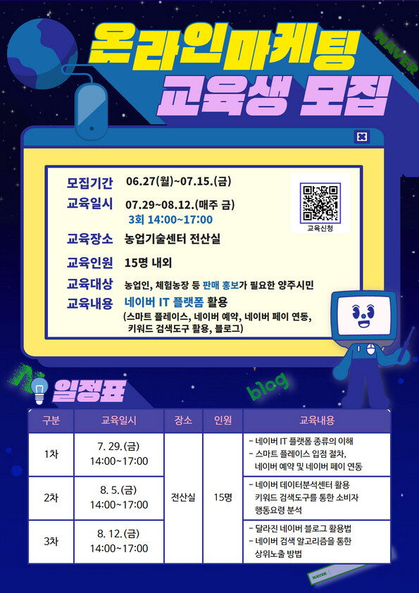 교육은 7월 29일부터 8월 12일까지 매주 금요일 2시부터 3시간, 총 3회 과정으로 농업기술센터 전산실에서 실습위주의 교육으로 진행될 예정이다.
