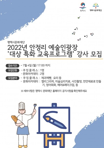 평택시문화재단 관계자는 “가을과 함께 시작될 대상특화 교육프로그램에 전문성과 교육 경험을 갖춘 예술 강사를 모집하니 많이 지원해주시길 바란다”고 전했다.