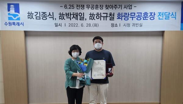 박미숙 수원시 복지여성국장은 故 박채일 이병 아내 김금순씨, 故 김종식 상병 조카 김병규씨, 故 하규철 중사 손자 하창백씨에게 화랑무공훈장을 전달했다.