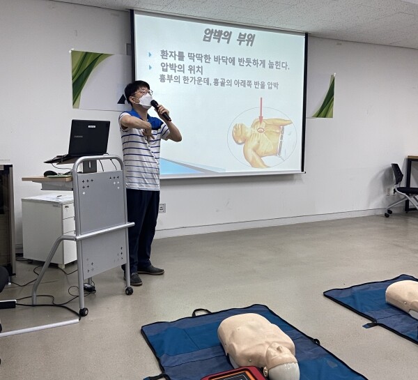 응급처치 교육은 응급상황 발생 시 대처 행동 요령을 시작으로 심폐소생술 기구 애니를 활용한 심폐소생술과 자동심장충격기 사용법과 기타 응급처치법 안내 순으로 진행됐다.
