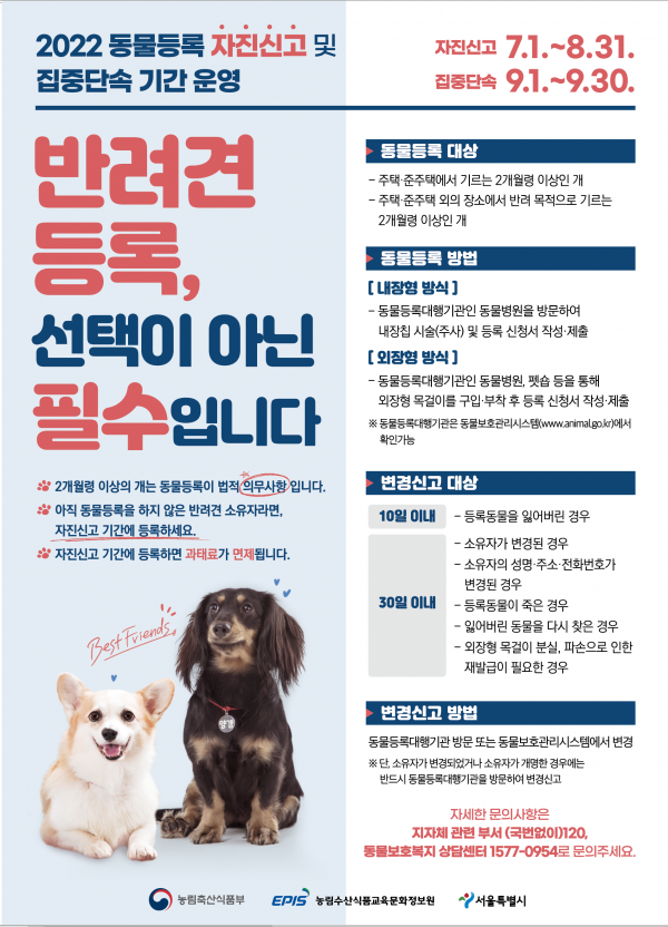 박유미 서울시 시민건강국장은 “동물등록은 소중한 반려동물을 지키기 위한 안전장치로 반려견주가 반드시 준수해야 법적 의무다 아직 동물등록을 하지 않은 시민은 자진신고 기간 동안 동물등록에 적극 참여해 주시기 바란다”며 “일상회복에 따라 반려견과 외출도 많아지고 있다 안전을 위해 목줄 착용, 배설물 수거 등 펫티켓을 지켜 주시기를 부탁드린다”고 말했다.