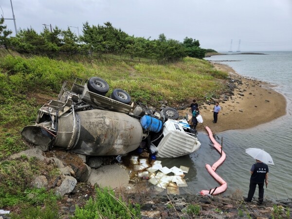 지난 27일 오전 10시 50분경, 시흥시 군자12교 부근에서 레미콘 차량이 앞서가던 승용차를 들이받은 뒤, 시화호로 전복돼 레미콘 차량에 실려 있던 시멘트와 자동차 오일이 누출되는 수질오염 사고가 발생했다.