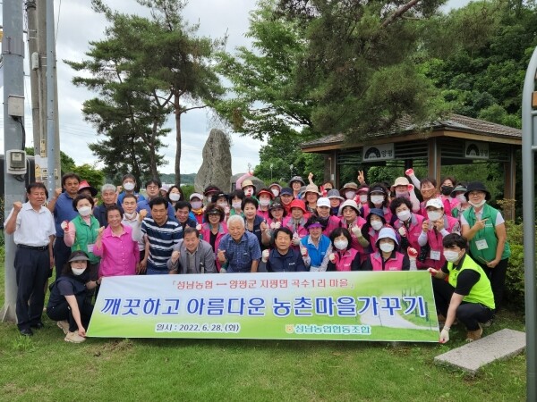 이날 성남농협 임직원 및 여성단체 회원들은 2016년부터 이어온 도농 자매결연 마을인 곡수1리를 방문해 ‘어울림 꽃밭 공원’ 조성과 괴은 이춘영 기념비 주변 환경정비를 하는 등 구슬땀을 흘려 봉사활동을 진행했다.