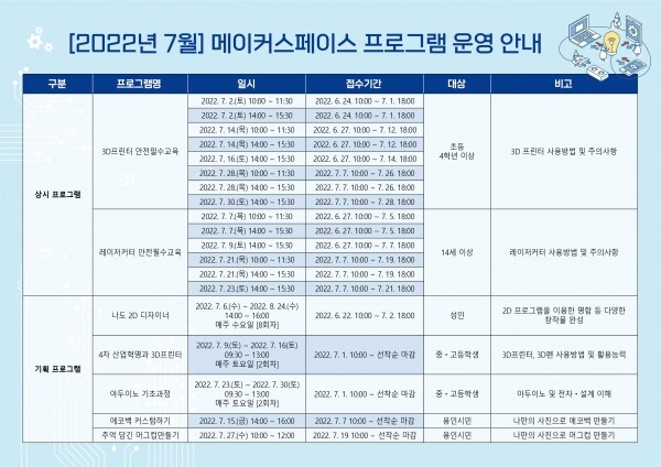 7월 교육에선 3D프린터 안전필수교육과 레이저커터 안전필수교육 등 상시프로그램을 진행한다.