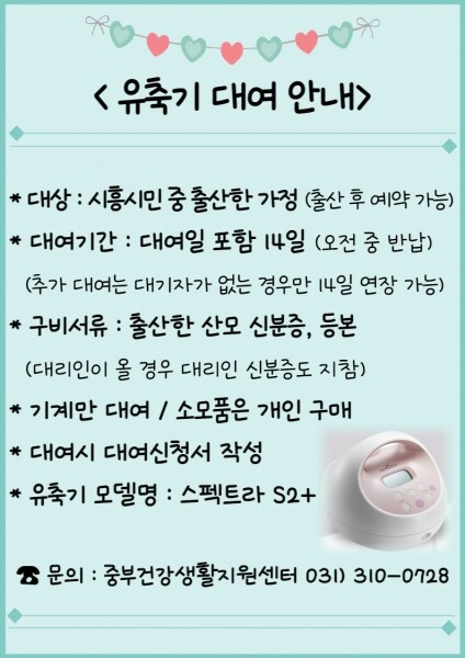 중부건강생활지원센터 관계자는 “유축기 대여를 통해 모유수유가 활성화될 수 있기를 바라며 앞으로 더욱 다양한 서비스 제공을 통해 모유수유율 향상에 기여하겠다”고 밝혔다.