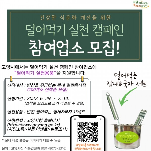 신청 대상은 고양시에서 반찬을 제공하는 일반 음식점으로 덜어먹기 지속 실천을 통한 식문화 개선에 동참할 의지가 있는 업소이다.