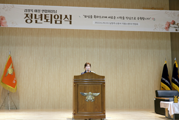 퇴임식 주인공인 김정옥 연합회장은 지난 1993년도 남양주소방서 지금도농여성의용소방대에 임명돼 29년여 재직기간 동안 태안군 기름유출 및 세월호 사회봉사와 2022년 부영아파트 화재지원 등 국민의 안전을 위해 다양한 의용소방활동을 펼쳤다.