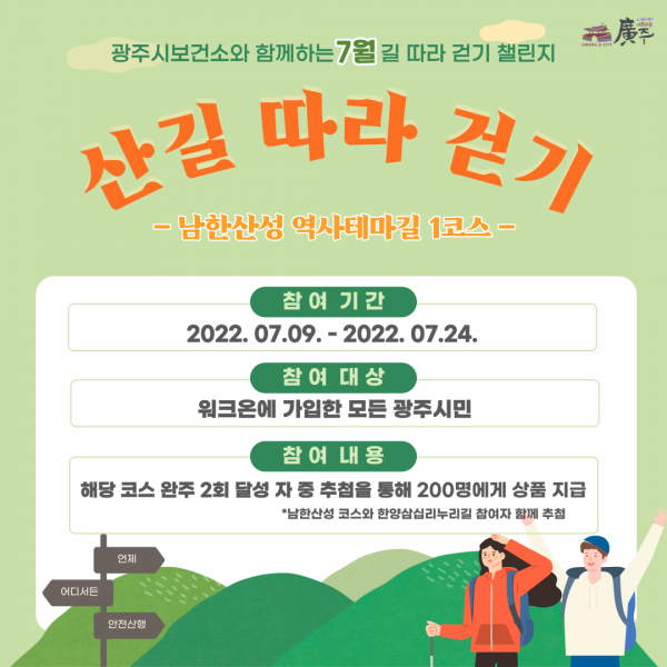 산길 따라 걷기 챌린지는 7월 9일부터 7월 24일까지 남한산성 역사테마길 1코스와 한양삼십리누리길 1코스 중 원하는 코스를 선택해 완주 2회 시 추첨을 통해 총 200명의 참가자에게 모바일 쿠폰을 제공한다.