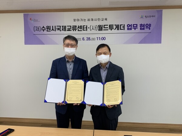 지난 6월 28일 수원시국제교류센터 세미나실에서 열린 협약식에는 이주욱 수원시국제교류센터장, 하영재 ㈔월드투게더 부회장 등 주요 관계자들이 참석했다.