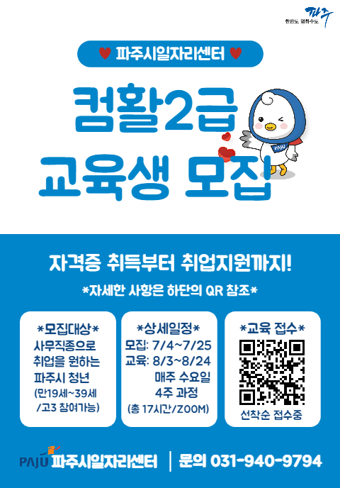 신청 자격은 주민등록상 주소지가 파주시인 만 19세~39세 청년으로 파주시일자리센터, 운정·문산 행정복지센터를 방문하거나 이메일로 신청하면 되고 지원자가 모집인원을 초과할 경우 취업의지 등 자체 심사를 통해 교육생을 선발한다.