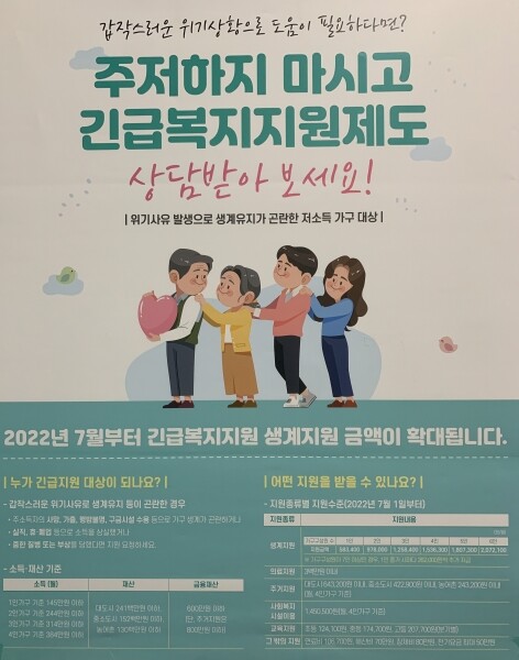 박화복 복지정책과장은 “긴급복지지원 확대로 위기상황에 처한 가구를 적극 발굴하고 신속하게 지원할 것”이라며 “고유가·고물가로 어려움을 겪는 저소득층 생활 안정에 기여하고자 최선을 다하겠다”고 말했다.