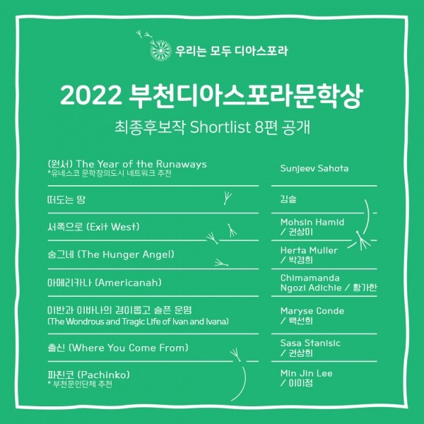 최종후보작에는 심사위원회에서 선정한 김숨 작가의 ‘떠도는 땅’ 등 작품 6편 유네스코 문학창의도시 네트워크에서 선정한 선지브 사호타의 ‘The Year of the Runaways’ 부천문인단체에서 추천한 이민진 작가의 ‘파친코’가 포함됐다.