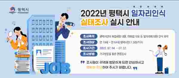 ‘2022년 평택시 일자리인식 실태조사’는 올해 2회째이며 조사한 자료는 지역주민을 위한 양질의 일자리 창출과 인력 수급정책 수립의 기초자료로 정책을 수립하는 데 적극 활용될 예정이다.