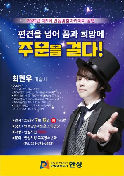 시 관계자는 “많은 분들이 오셔서 최현우 마술사와 함께 마술처럼 즐거운 시간을 보내시길 바란다”며 “일상 회복과 함께 모든 세대가 공감할 수 있는 좋은 강연을 제공하기 위해 지속적으로 노력하겠다”고 전했다.