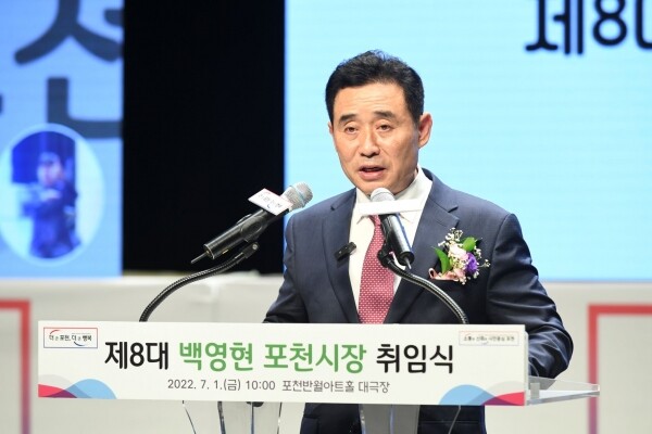 백영현 포천시장은 이날 취임사를 통해 “원칙과 상식이 지켜지는 사회를 만들기 위해 시정철학을 ‘소통과 신뢰의 시민중심 포천’이라 정했다”며 “포천시민의 행복을 위해 혼신의 노력을 다하고 시민의 뜻에 부합하는 행정을 펼쳐 모든 권력을 시민에게 돌려드리는 시민의 지방정부로 거듭나겠다”고 전했다.