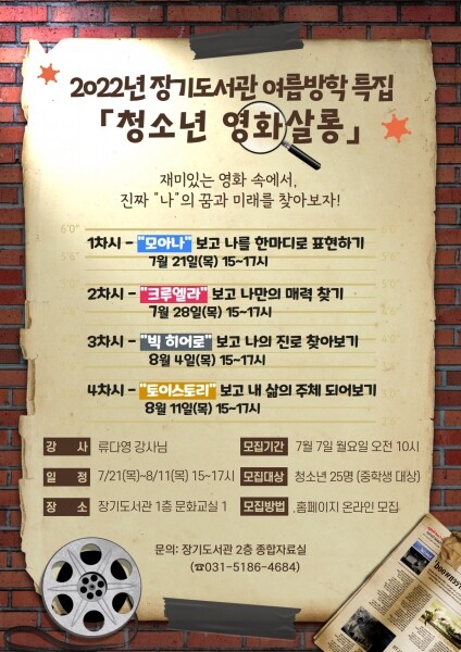 ‘청소년 영화살롱’ 강연은 여름방학을 맞이해 네 가지 각양각색의 영화를 통해 청소년들이 자신을 돌아보는 시간을 가지고 내면을 다채롭게 표현하는 강연이다.