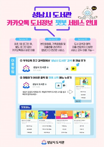 스마트폰의 카카오톡 앱 친구 검색창에서 ‘성남시 도서관’을 찾아 채널 추가, 채팅하기 아이콘을 차례로 누르면 해당 서비스를 이용할 수 있다.