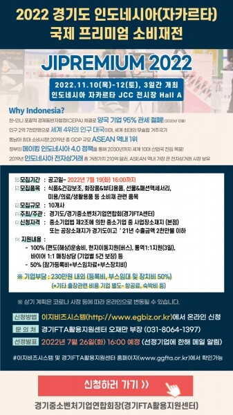 경기도와 경기지역FTA활용지원센터는 오는 11월 10~12일 인도네시아에서 열리는 ‘2022 자카르타 국제 프리미엄 소비재전’에 참가할 도내 소비재 기업을 모집한다고 4일 밝혔다.