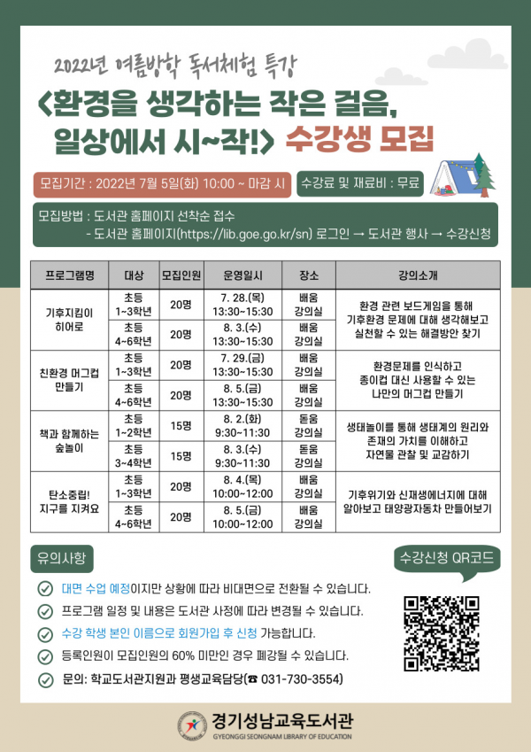 주요 내용은 기후지킴이 히어로 친환경 머그컵 만들기, 책과 함께하는 숲놀이, 탄소중립 지구를 지켜요 등이다.