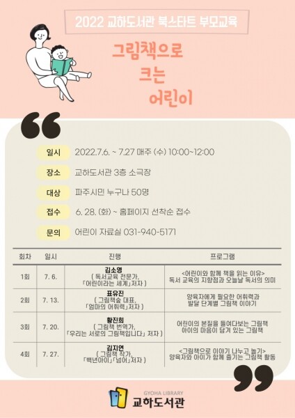 이현주 교하도서관장은 “올해 어린이날 100주년을 맞는 해인 만큼 그림책을 통해 어린이를 더욱 깊이 이해하고 알아가는 시간이 되도록 부모교육을 준비했다”고 말했다.