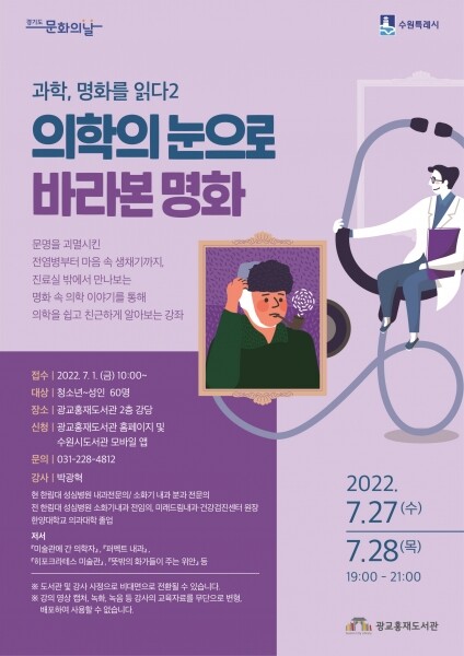 광교홍재도서관 홈페이지 ‘통합예약/신청→독서문화프로그램’에서 ‘‘과학, 명화를 읽다 2: 의학의 눈으로 바라본 명화’’을 선택해 신청하면 된다.