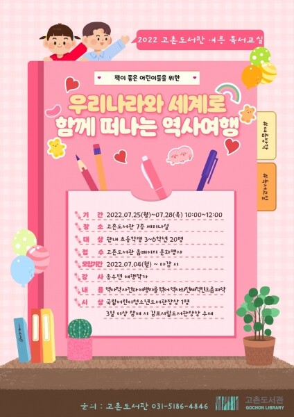이번 하반기에 여행을 갈 계획이라면 ‘우리나라와 세계로 함께 떠나는 역사 여행’ 으로 미리 여행을 떠나보는 것은 어떨까? 강좌는 7월 25일부터 7월 28일 오전 10시부터 12시까지 4회에 걸쳐 대면형식으로 진행되고 장소는 고촌도서관 7층 세미나실이다.