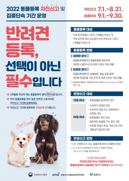 한편 과천시 관계자는 “과천시에서는 반려동물 소유자가 관내 동물병원에서 1만원의 비용으로 ‘내장형 동물등록’을 할 수 있도록 지원사업을 실시하고 있으니 많은 분들의 관심을 바란다”며 “동물등록은 반려견의 보호와 유실·유기를 방지하는 최소한의 안전장치이자 반드시 지켜야 할 법적 의무로 꼭 등록해달라”고 당부했다.