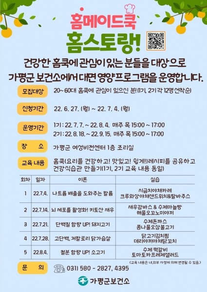 ‘홈메이드 쿡, 홈스토랑’은 외식과 나트륨섭취량을 줄이기 위한 건강한 홈밥 만들기 교육을 제공해 올바른 식생활 관리에 관심을 유도 하고 건강한 홈쿡을 스스로 만들어봄으로써, 식습관을 균형 있게 개선하고 가평군의 성인 비만율을 낮출 수 있도록 지도하는 프로그램이다.