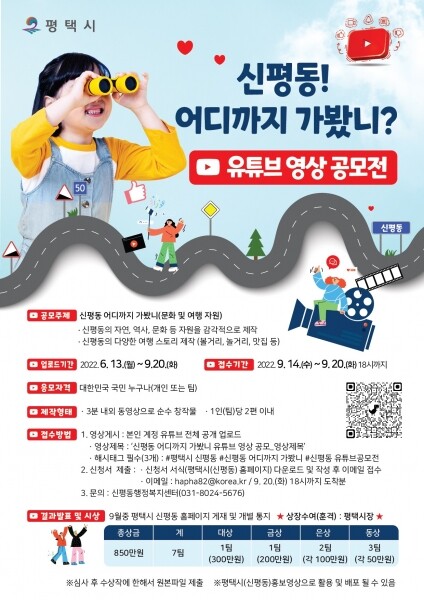 이번 공모전의 주제는 신평동의 자연, 역사 및 문화자원과 볼거리·놀거리·먹거리 등의 여행자원이며 대한민국 국민이면 누구나 응모할 수 있다.
