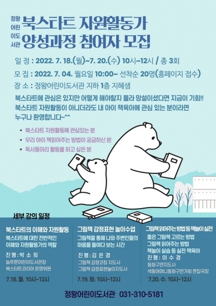 과정을 통해 북스타트 사업의 전반적인 이해와 책 꾸러미 배부 및 책 놀이프로그램 활동 등 북스타트 관련 사업 운영을 함께할 기초 역량을 키우게 된다.