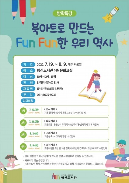 행신도서관 문화행사 담당자는 “역사교육에 대한 중요도가 증가하고 있다 여름방학을 맞이해 이번 교육이 어린이들이 우리나라 역사에 대한 관심을 키우고 바람직한 역사관을 확립하는 기회가 되길 바란다 앞으로도 책 읽기와 북아트 만들기를 결합한 다양한 프로그램을 준비하겠다"고 전했다.