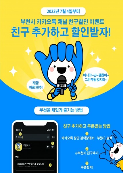 안윤경 행정국장은 “시민 여러분과 관내 소상공인분들의 일상 회복을 응원하는 취지로 부천시 카카오톡 친구와 함께하는 다양한 할인 이벤트를 준비했다”며 “제휴·할인 업체를 계속 발굴해 더 많은 시민이 혜택을 받을 수 있도록 노력하겠다”고 말했다.
