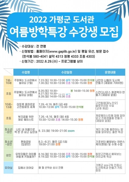 여름방학 특강으로는 방학이 시작되는 7월 말부터 만들기 프로그램 주말에는 도서관에서 놀아요, 선생님과 함께 방학동안 고전 한권을 완독해보는 이토록 흥미로운 고전동화의 세계, 기후변화를 막기 위한 여러 가지 노력을 배워보는 북극곰을 위한 제로웨이스트가 시작될 예정이다.