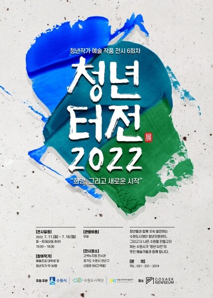 왕건 수원시청년지원센터장은 “코로나19로 인해 비대면으로 열렸던 청년터전 전시회가 올해는 대면 행사로 진행돼 많은 시민이 관람할 것으로 기대된다”며 “일상에 지친 시민을 위로하고 청년 예술인을 지원할 수 있는 사업·프로그램을 지속해서 마련할 것”이라고 말했다.