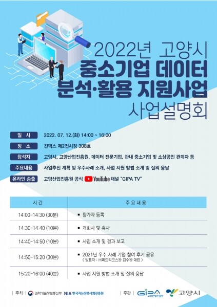 이번 설명회는 관내 중소기업 및 소상공인 등을 대상으로 과학기술정보통신부(한국지능정보사회진흥원)가 주관하는‘2022년 중소기업 데이터 분석·활용 지원 사업’에 참여할 중소기업을 대상으로 사업 지원 내용 및 참여 방법 등을 설명하기 위한 자리이다.