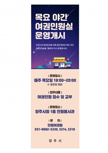 목요 야간 민원실은 평일 낮시간 직장 근무와 가사일 등으로 여권 발급 등에 어려움을 겪는 시민들의 불편 해소를 위해 매주 목요일마다 운영하다 지난 2020년 4월부터 잠정 중단됐다.