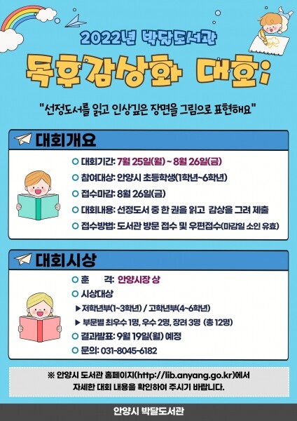 박달도서관 관계자는 “여름방학을 맞은 관내 초등학생들에게 독서 동기를 부여해 책 읽기에 흥미를 느끼게 하고 자신의 생각과 느낌을 독창적으로 표현해 보는 기회를 제공하고자 본 대회를 기획했다”고 전했다.