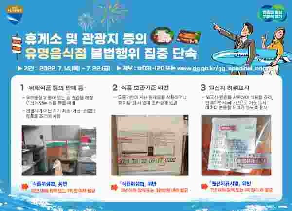 김민경 경기도 특별사법경찰단장은 “이번 단속은 코로나19 일상 회복에 따른 휴가철 여행 수요 증가를 고려해 주요 관광지 내 음식점의 위생 수준 향상 및 안전한 먹거리 제공이 목적”이라며 “식품 위생 관련 사고를 사전에 예방할 수 있도록 최선을 다할 것”이라고 말했다.