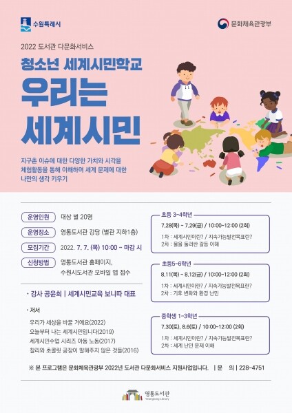 영통도서관 홈페이지 ‘통합예약/신청→독서문화프로그램’에서 ‘[대면 강의] 우리는 세계시민’을 선택해 신청하면 된다.