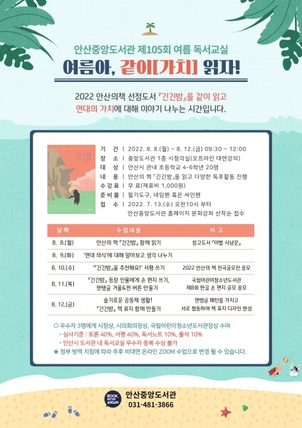 이번 여름 독서교실은 ‘여름아, 같이[가치] 읽자’를 주제로 2022년 안산의 책 어린이부문 선정도서 ‘긴긴밤’을 활용해 안산의 책 함께 읽기 생각 나누기 서평 쓰기 손 편지 쓰기 협동작품 만들기 등의 다양한 독후활동이 오프라인 대면 강의로 진행된다.