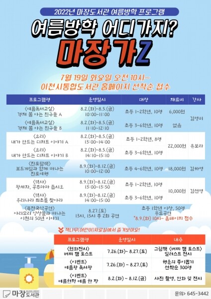 프로그램 참여를 희망하는 어린이는 7월 19일 오전 10시부터 이천시통합도서관 홈페이지를 통해 선착순으로 접수 후 참여할 수 있다.