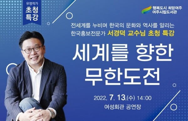 이번 특강은 ‘2022 여주 청소년 같이 한마당’과 연계해 진행되는 강연으로 관내 청소년 200여명이 참석할 예정이며 서경덕 교수의 적극적인 실행력과 현실감 있는 경험담이 청소년들의 큰 호응을 얻을 것으로 기대된다.